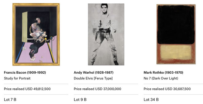 Warhol's Double Elvis (Ferus Type) (1963) sold for $37 million (estimate was in the region of $30 million). It last sold at Sotheby’s New York in May 2012, also for $37 million.