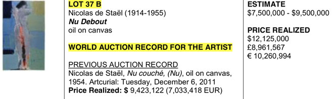 Nicolas de Stael’s Nu Debout (1953) sold for $12.1 million (est. $7.5-9.5 million). It last sold at Artcurial Paris 2013 for €4,690,690.